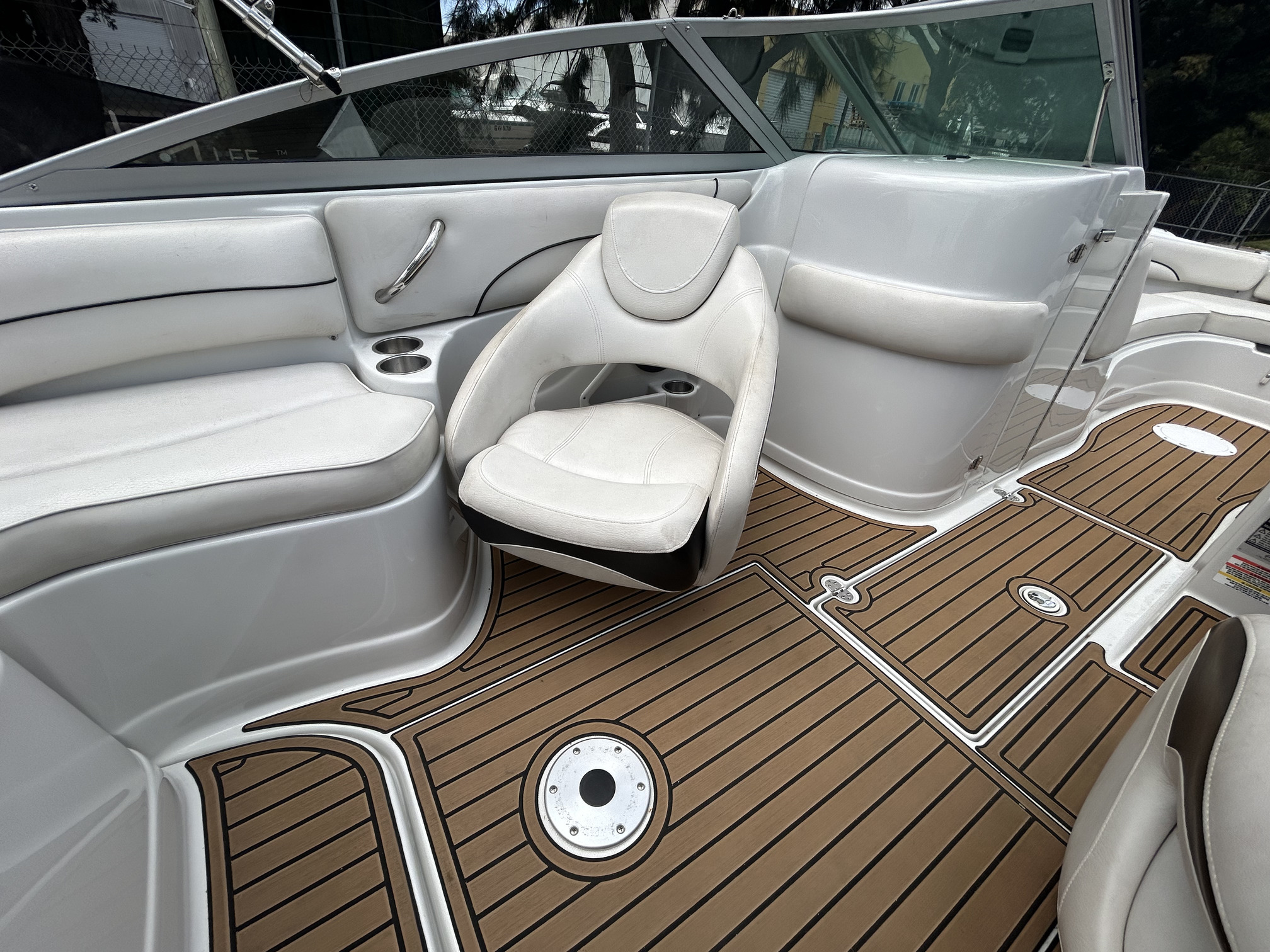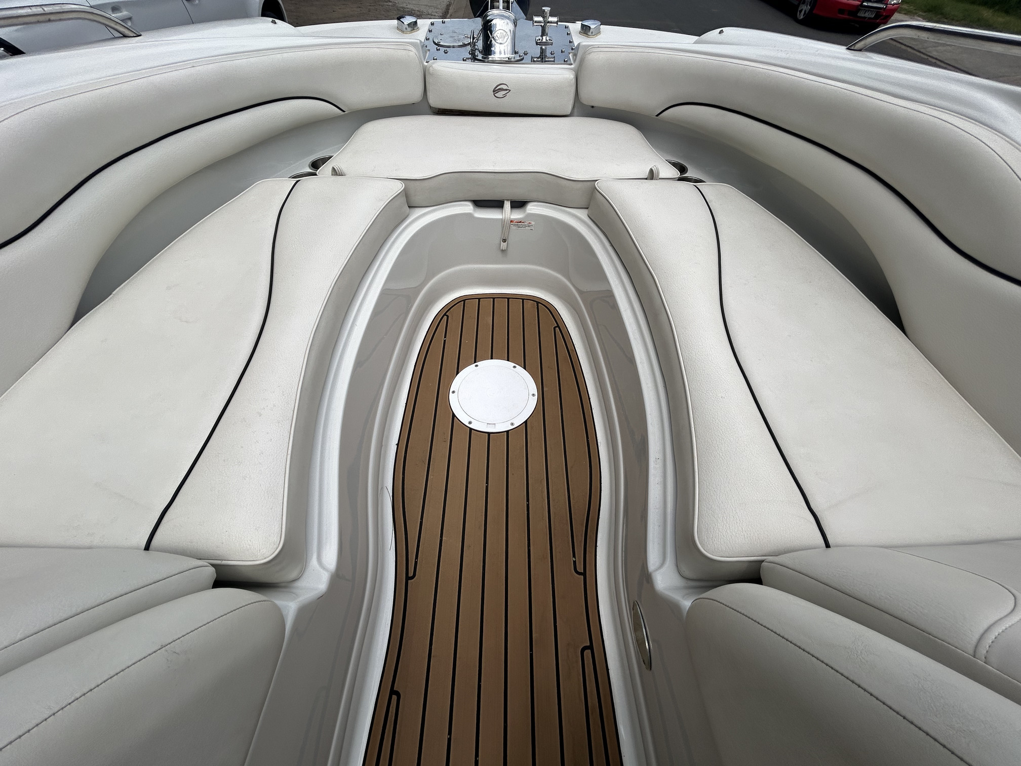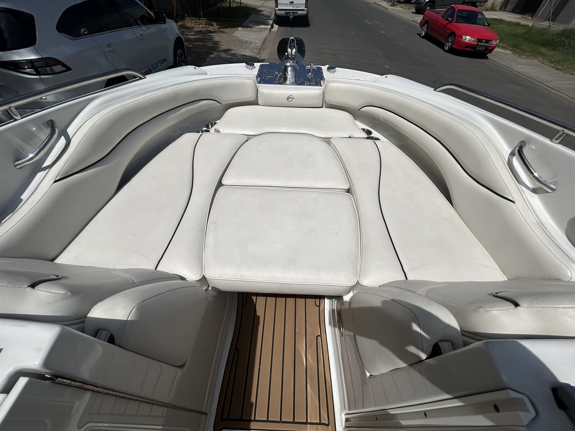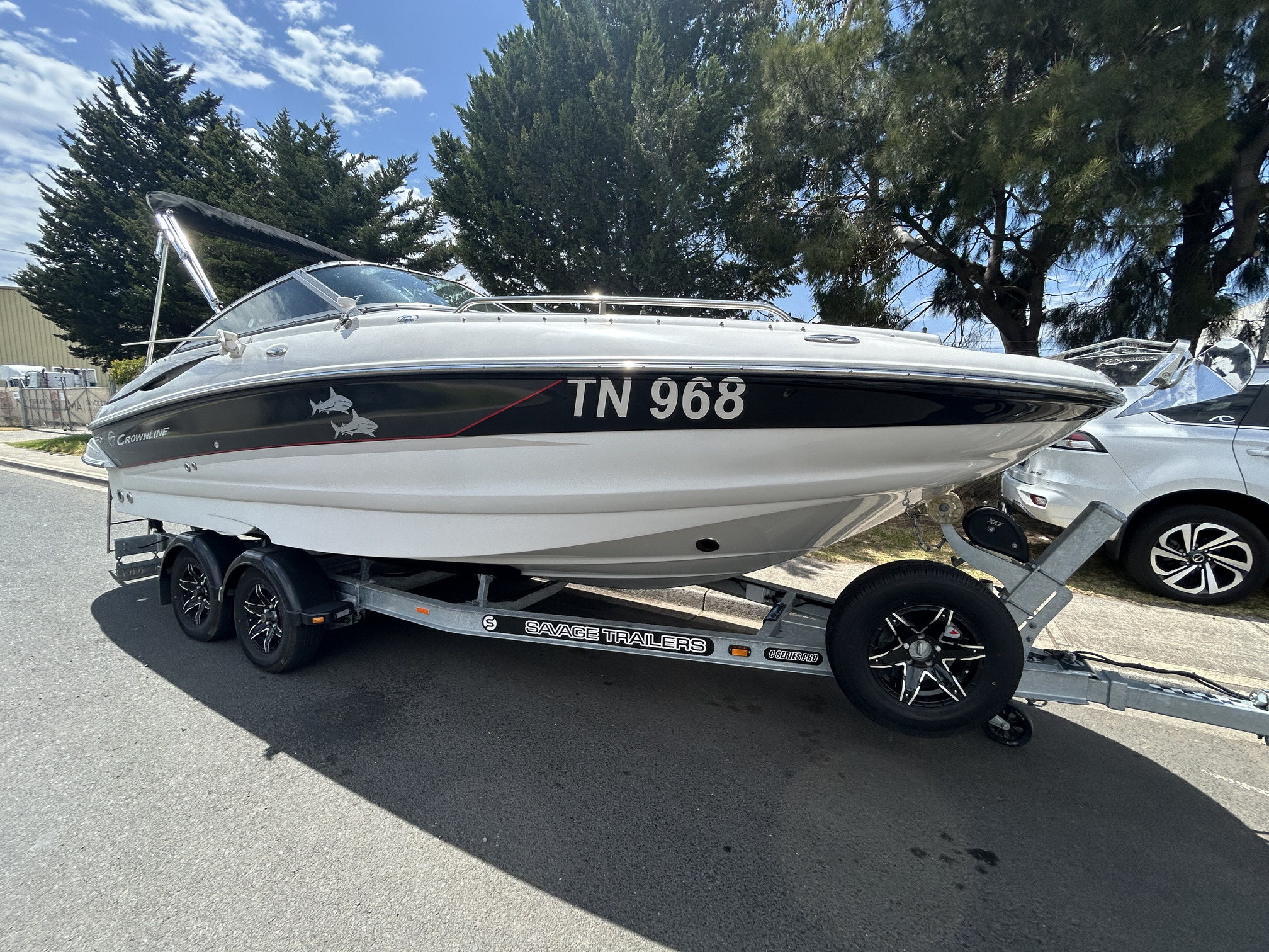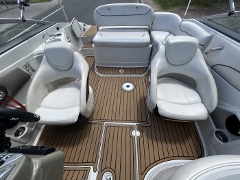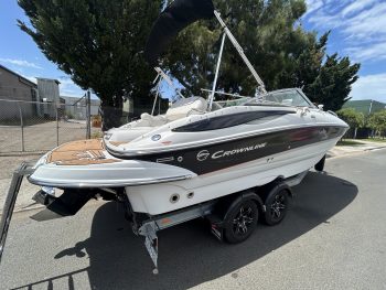 Crownline 220 Ex Bowrider, 2008 model, Aussie Delivery, Mercruiser 5.0L MPi V8 260 HP, stern drive, with 150 hours use and good history. New Savage c- channel tandem trailer with Alko braking system, removeable drawbar, mags and spare. I am not really sure where to start with this boat as it is so highly optioned with so many recent upgrades that it is really a one-off opportunity to buy a truly unique boat at a very reasonable price. So, for starters – how about bow and stern thrusters! Yes, that’s right, so easy to handle when docking that you will look like the expert you have always imagined you are around the marina, or at the ramp; this Lewmar thruster package is powered with twin lithium batteries, then there is the electric drum anchor winch with custom stainless bow work and stainless anchor, electric toilet, QL auto trim tabs, twin Simrad screens a VHF radio, new Rockford Fosgate Bluetooth stereo, EVA flooring throughout including swim platform, upgraded Italian Guzzi steering wheel on tilt helm, new bimini canvas, bow and cockpit cover, docking lights, Bow infil cushions, cockpit table, and plenty more! The Crownline 220 EX has a very social layout with a 3-position aft sunlounge, bolster helm seating, freshwater tank with deck shower and cockpit sink, transom and bow doors to keep pets or toddlers safe, full instrumentation, plenty of storage and a decent swim platform with boarding ladder. The ‘Fast Tab’ hull design offers efficient performance and improved fuel economy. This big ‘deck boat’ design can handle up to 10 passengers so you have plenty of space for all of those new friends you will have once you back this beauty into your driveway! Don’t muck around this is a genuine bargain and won’t last too long at this price.