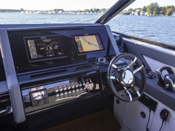 Cruisers Yachts 38 GLS Sports Bow Rider, 2021 model, Twin Mercruiser 430 HP V8’s with Axius joystick docking including autopilot and skyhook functions and closed-circuit cooling system, with only 90 hours use.   This long weekender is a very highly optioned boat with stacks of cool standard features, a brilliant layout, performs like a sports boat, but is built and feels like a far bigger cruiser.  First the extras -we’ve already mentioned the ‘Axius Premier’ Joystick system and ‘Seacore’ engines, but let’s add to that the diesel generator, AGM battery package, extended swim platform with hydraulic platform lift, ‘Sure Shade’ electric cockpit awning aft, manual foredeck shade awning, premium ‘Simrad’ electronics package with twin 12” screens, radar,  and VHF, Rockford Fosgate premium sound system,  upgraded deluxe cockpit seating and custom table with covers, bow filler cushion extension,  deck wash down system, electric cockpit BBQ, ice maker, ‘Seadek’ flooring throughout, underwater lights, 28’ TV and more!   When it comes to layout – the cockpit area is perfect for lazy days out on the water with the starboard side beach door expanding the play area and the swing around aft seat back-rest and the big swim platform maximising your connection with the water.  The cockpit bar space complete with bar stool makes it a great entertainer, there is plenty of seating aft, but then there is the big bow area that also has generous seating and a table or converts to a big sun lounge. Downstairs there is accommodation for 4 or 2 and a comfortable lounge area with TV, head room is perfect for a taller crew, and the toilet area is also generous with good showering space and luxury vanity.     The colour scheme throughout is modern and tasteful.    Is this the perfect weekender?  We think so and when you look at replacement cost for a new boat order, we also think this is a bargain!   Aussie Boat Sales is proud to be the Australian distributor for Cruisers Yachts, and we have cared for this boat from day one. It is beautifully presented, perfectly maintained and is ready to take your boating to another level.