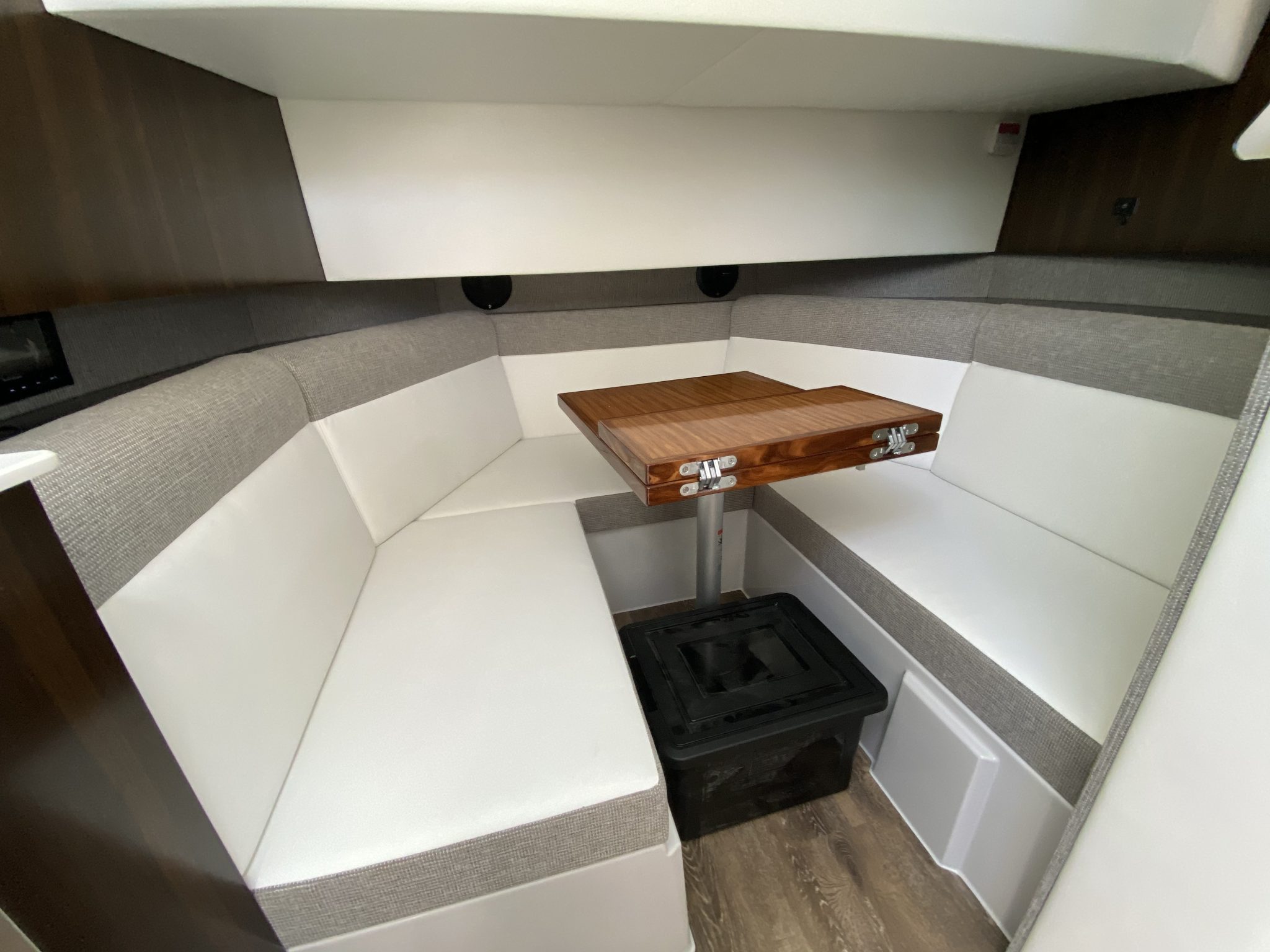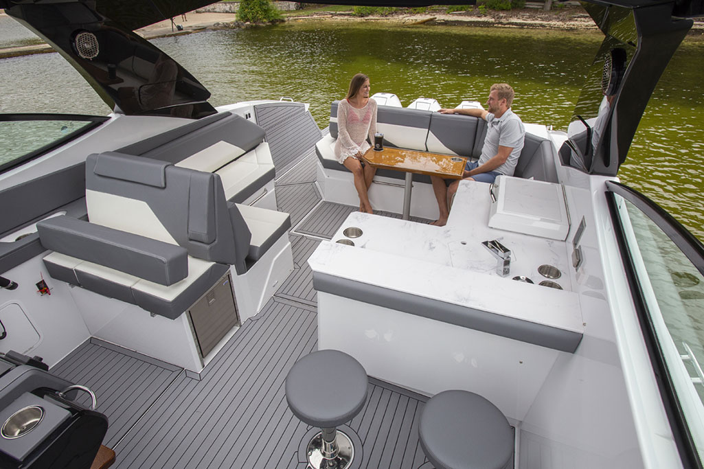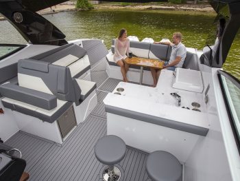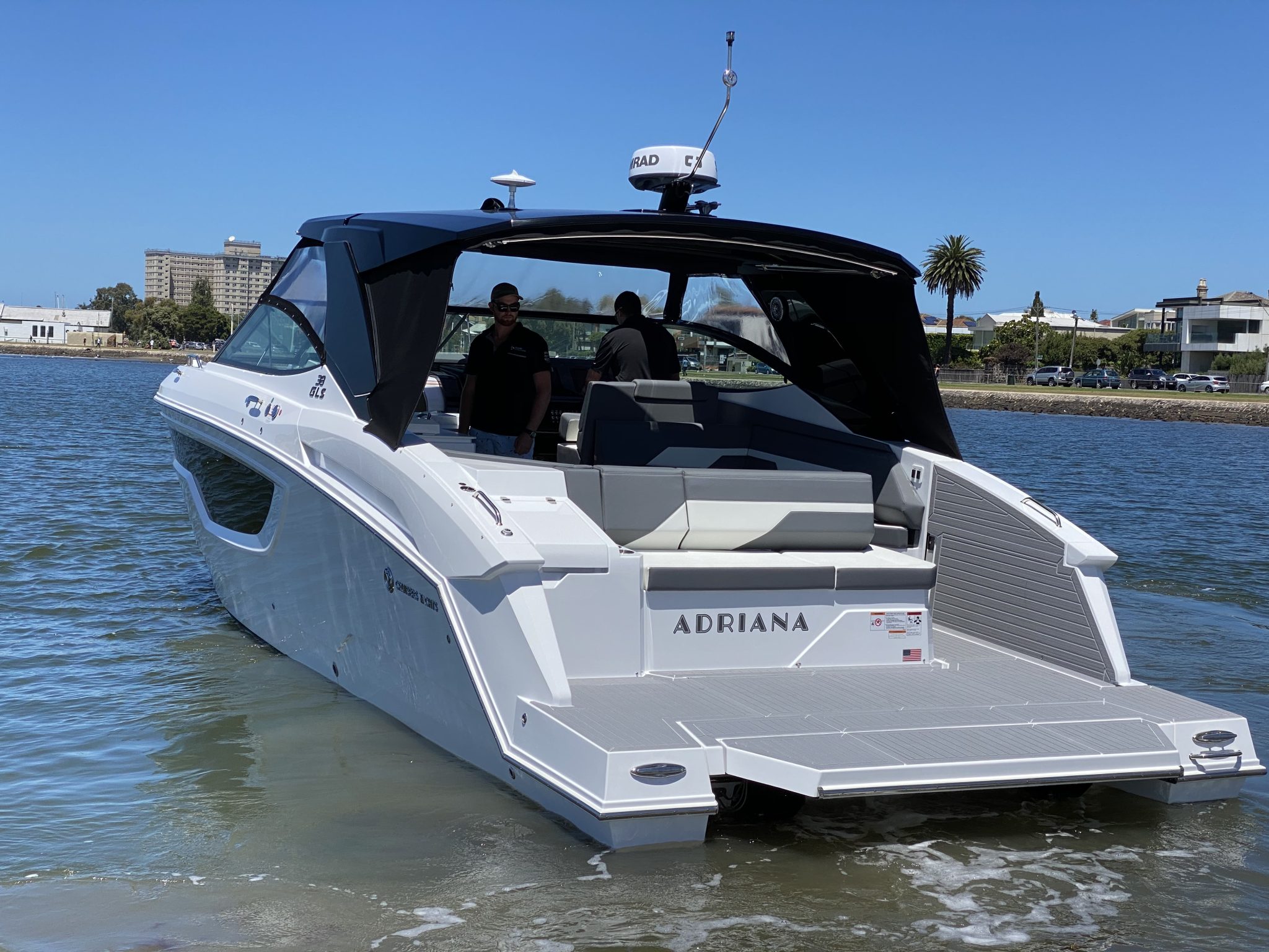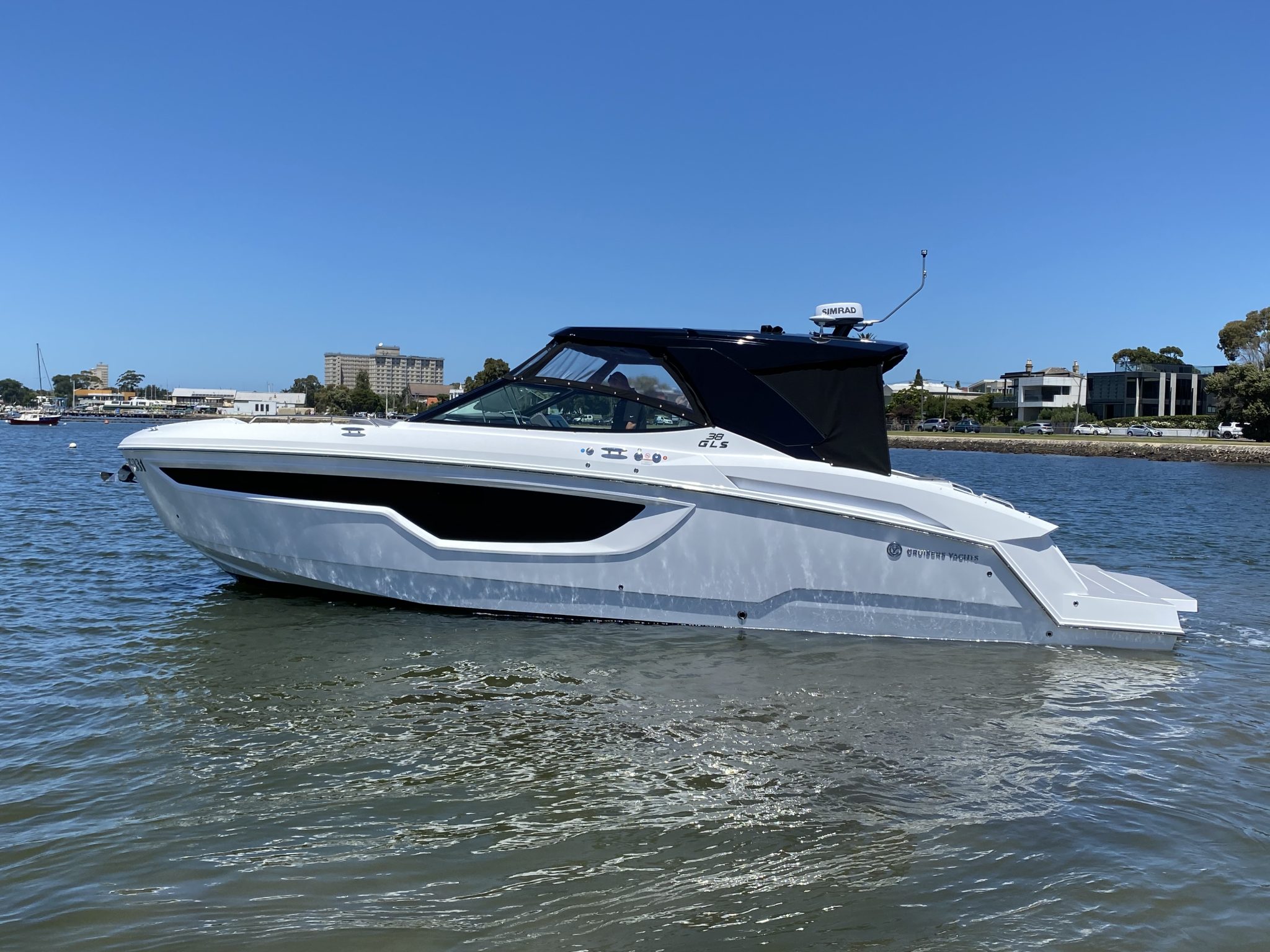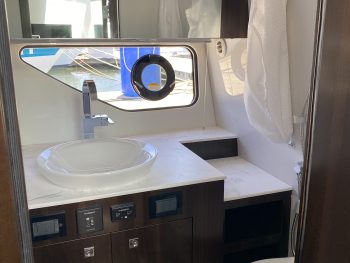 Cruisers Yachts 38 GLS Sports Bow Rider, 2021 model, Twin Mercruiser 430 HP V8’s with Axius joystick docking including autopilot and skyhook functions and closed-circuit cooling system, with only 90 hours use.   This long weekender is a very highly optioned boat with stacks of cool standard features, a brilliant layout, performs like a sports boat, but is built and feels like a far bigger cruiser.  First the extras -we’ve already mentioned the ‘Axius Premier’ Joystick system and ‘Seacore’ engines, but let’s add to that the diesel generator, AGM battery package, extended swim platform with hydraulic platform lift, ‘Sure Shade’ electric cockpit awning aft, manual foredeck shade awning, premium ‘Simrad’ electronics package with twin 12” screens, radar,  and VHF, Rockford Fosgate premium sound system,  upgraded deluxe cockpit seating and custom table with covers, bow filler cushion extension,  deck wash down system, electric cockpit BBQ, ice maker, ‘Seadek’ flooring throughout, underwater lights, 28’ TV and more!   When it comes to layout – the cockpit area is perfect for lazy days out on the water with the starboard side beach door expanding the play area and the swing around aft seat back-rest and the big swim platform maximising your connection with the water.  The cockpit bar space complete with bar stool makes it a great entertainer, there is plenty of seating aft, but then there is the big bow area that also has generous seating and a table or converts to a big sun lounge. Downstairs there is accommodation for 4 or 2 and a comfortable lounge area with TV, head room is perfect for a taller crew, and the toilet area is also generous with good showering space and luxury vanity.     The colour scheme throughout is modern and tasteful.    Is this the perfect weekender?  We think so and when you look at replacement cost for a new boat order, we also think this is a bargain!   Aussie Boat Sales is proud to be the Australian distributor for Cruisers Yachts, and we have cared for this boat from day one. It is beautifully presented, perfectly maintained and is ready to take your boating to another level.