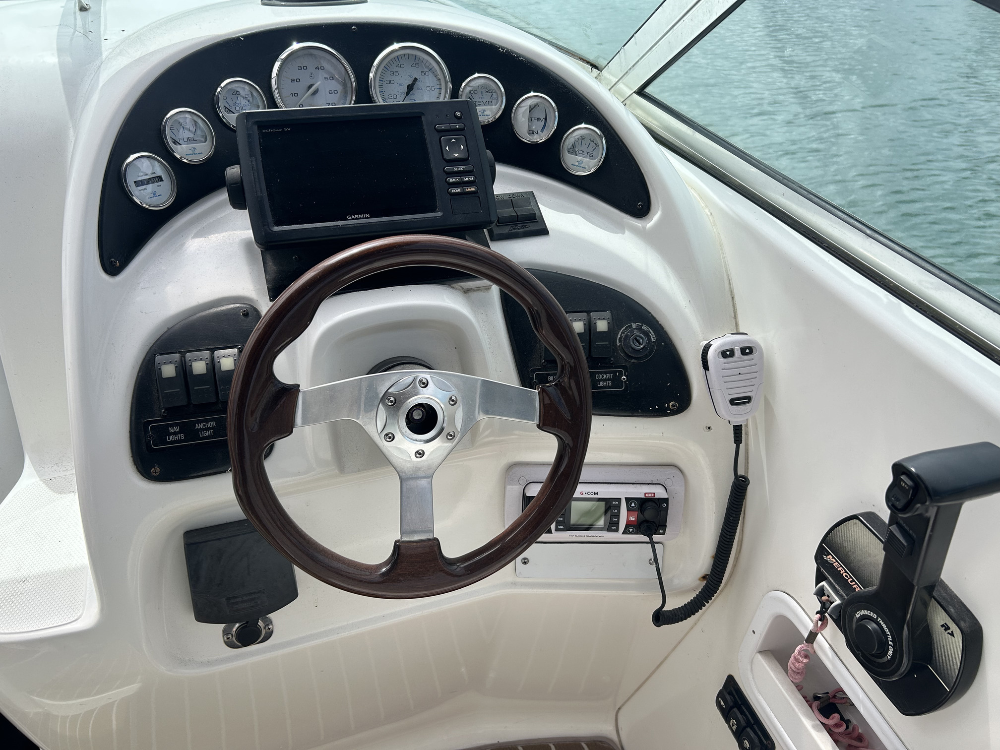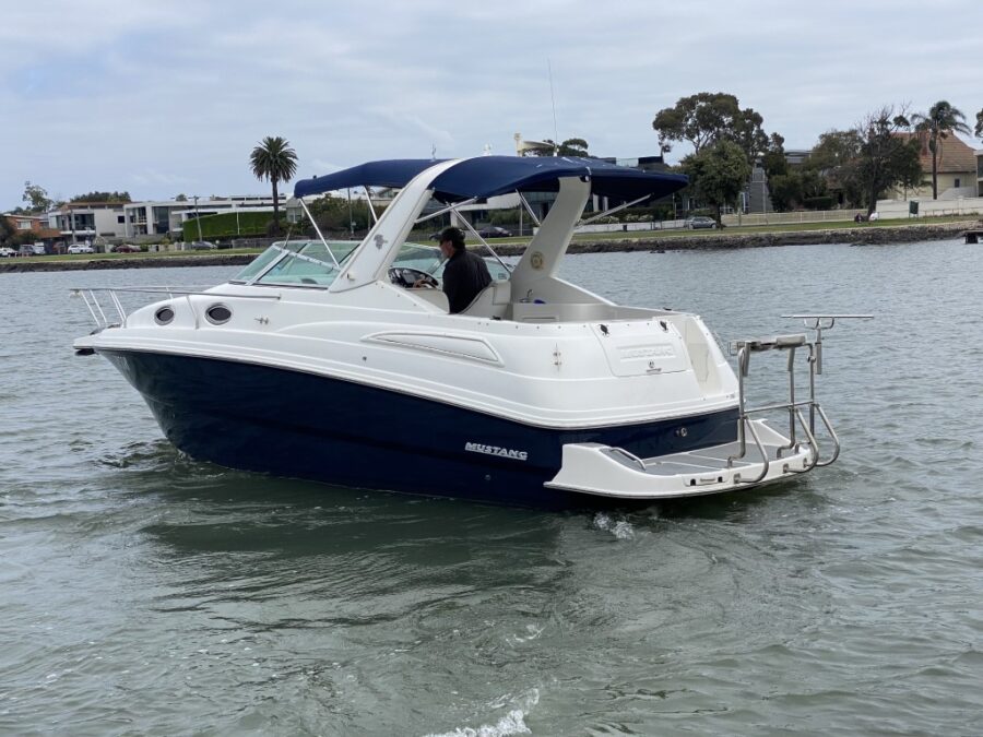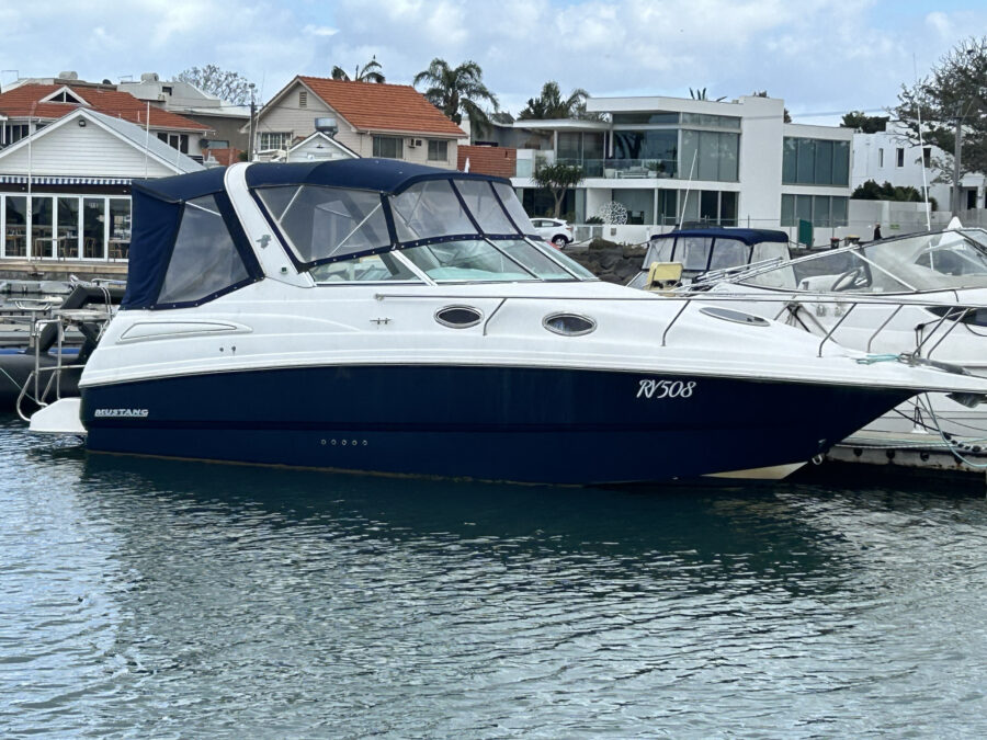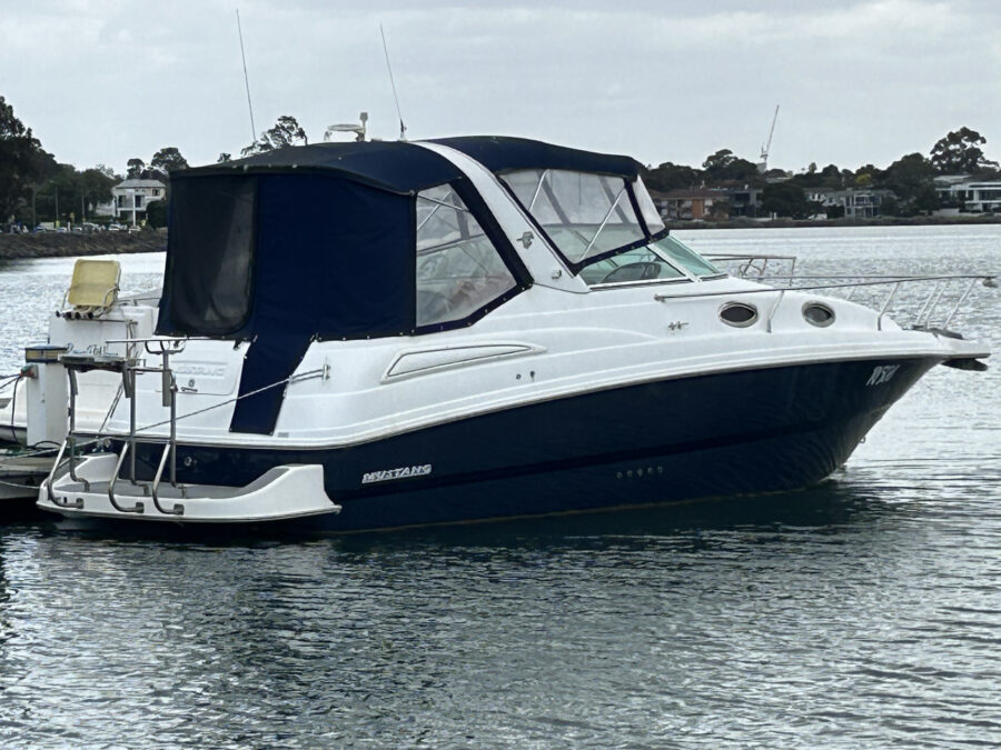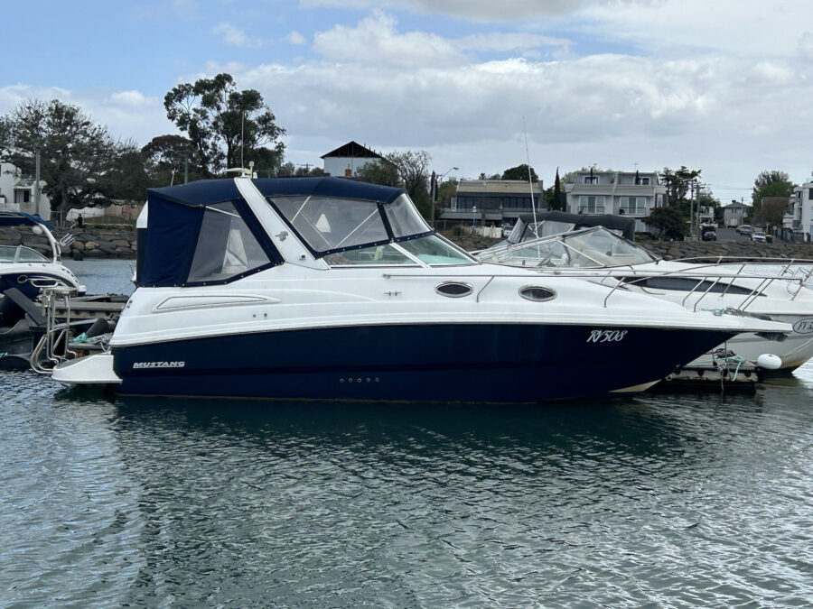 1 Hull/sMustang 2800 Sports Cruiser, 2001, Mercruiser 5.0L EFI 260 HP V8, (close circuit cooled) bravo stern drive, this boat had major engine out mechanical work undertaken during covid, including new riser manifolds, new transom plates and reconditioned cylinder heads, at the same time the hull was 2 pack painted, an upgraded Garmin GPS/Sounder, and Seadeck on the swim platform was added along with a bunch of other upgrades. Since then, the cockpit has been re-upholstered and general maintenance has been diligently carried out with annual services, antifoul and detailing. This tidy boat is nicely optioned with stainless stern rail, BBQ and bait board set up, transom shower, swim ladder, Trim tabs, electric anchor winch with chain counter, cockpit carpets, Pressure hot water, 12/240V fridge, dual fuel stove, 240 Volt shore power with battery charger, TV/DVD, C.D Stereo, VHF & 27MHZ radios and more! This is a nice example of these popular entry level cruisers, a marina berth is available in Williamstown for you to enjoy.