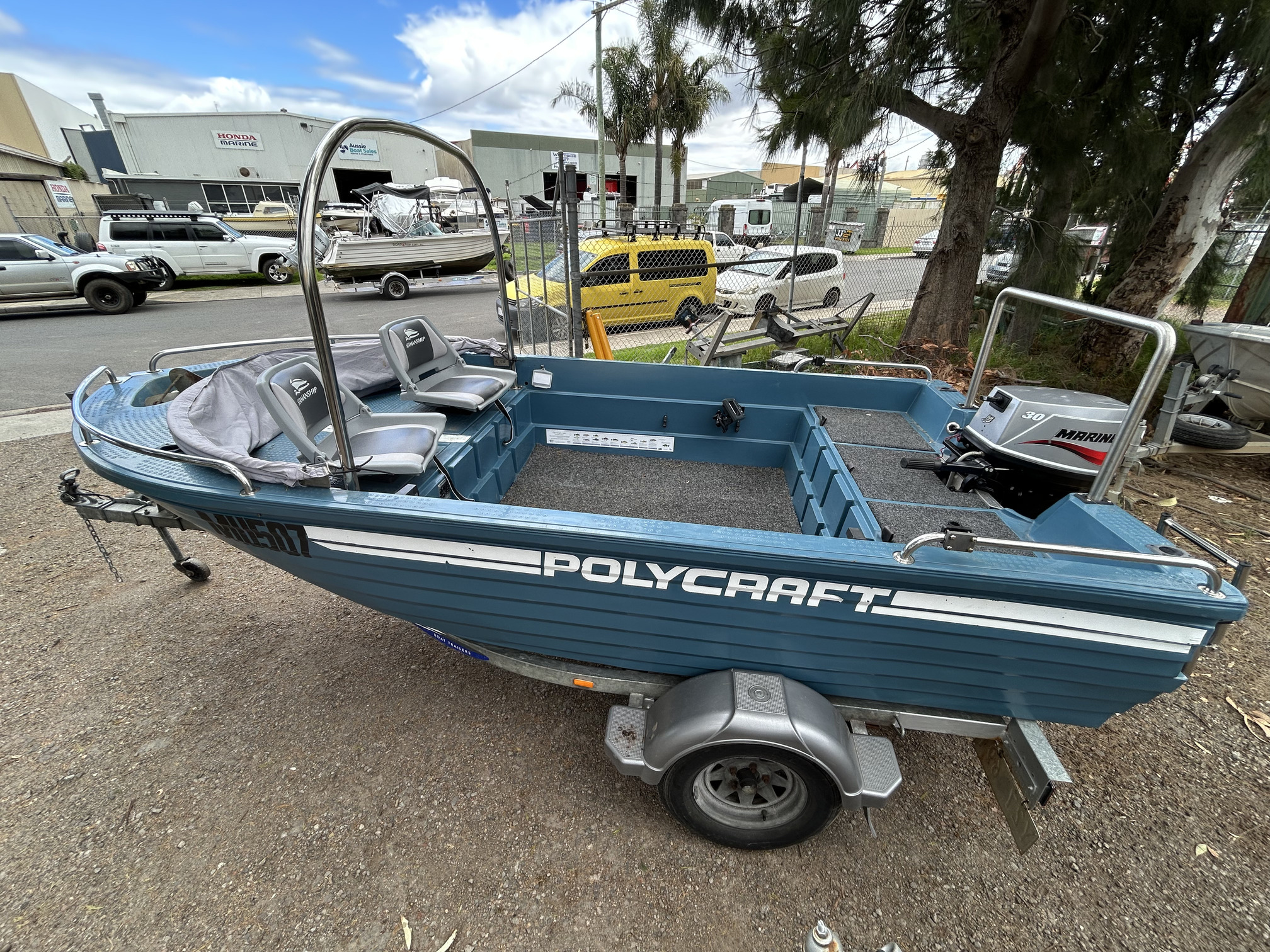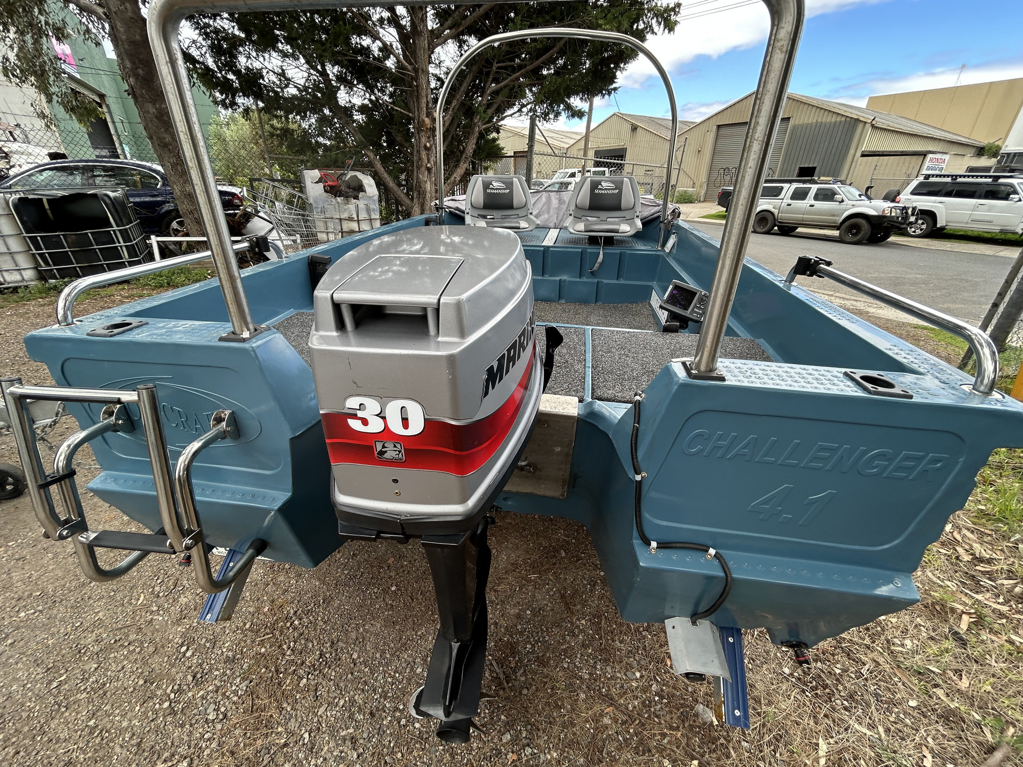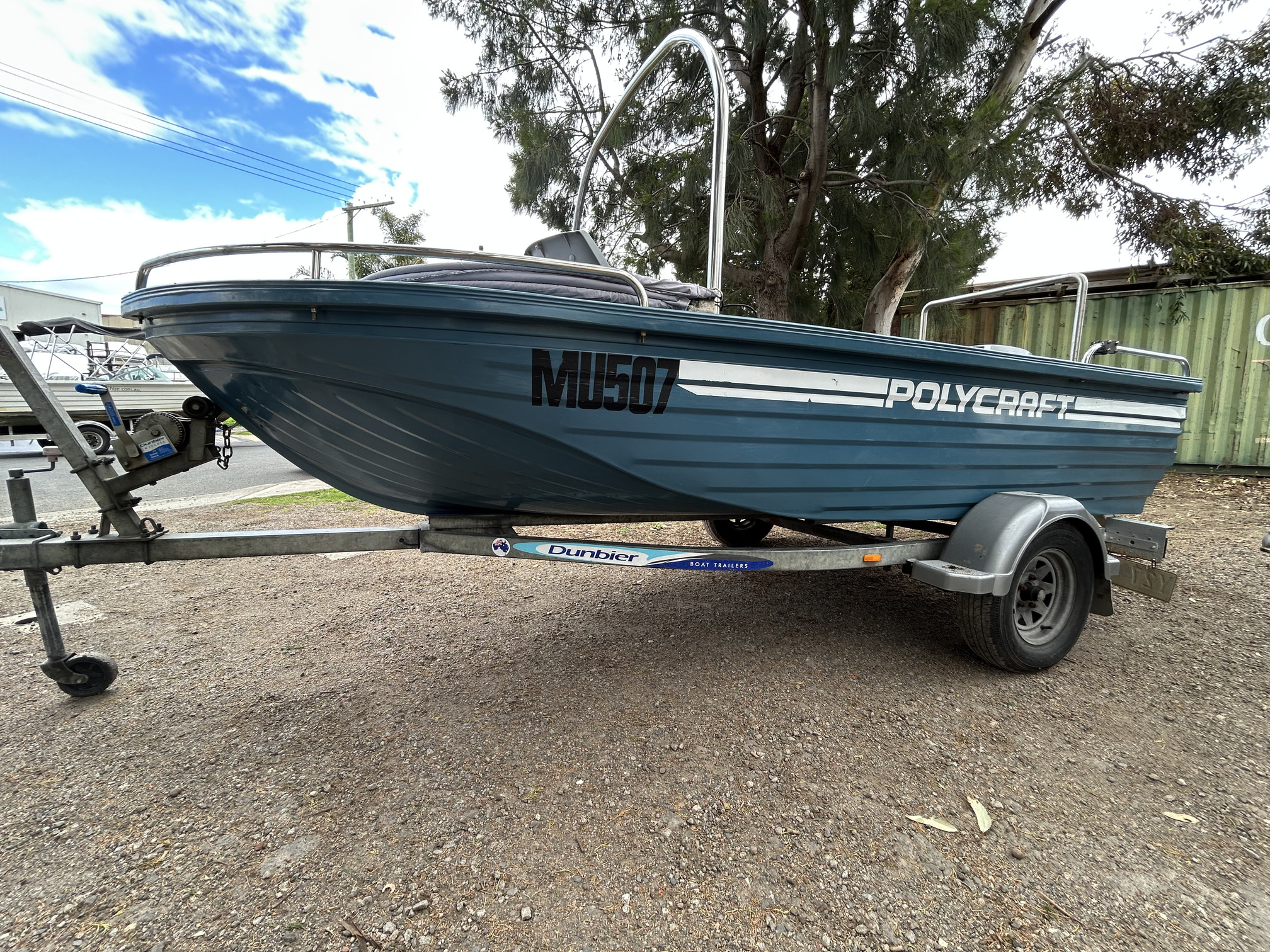 Polycraft 410 Challenger, 2010 model, open deck version, Mariner 30 HP outboard, Dunbier trailer, Lowrance Elite 5 GPS/sounder, marine floor carpet on main floor and rear seats, centre transom infil board, rear storage bait box, swim ladder, stainless frames for dodger and all over cover, rod holders, 2 x swivel seats mounted in bow – perfect to tuck under the dodger and get out of the sun or rain for a comfortable fish and more! These 410 Challengers are super stable and super easy to launch, garage, tow and handle. They are the perfect tributary boat that can tackle rougher bay conditions and they make a great first boat option, especially at this price.
