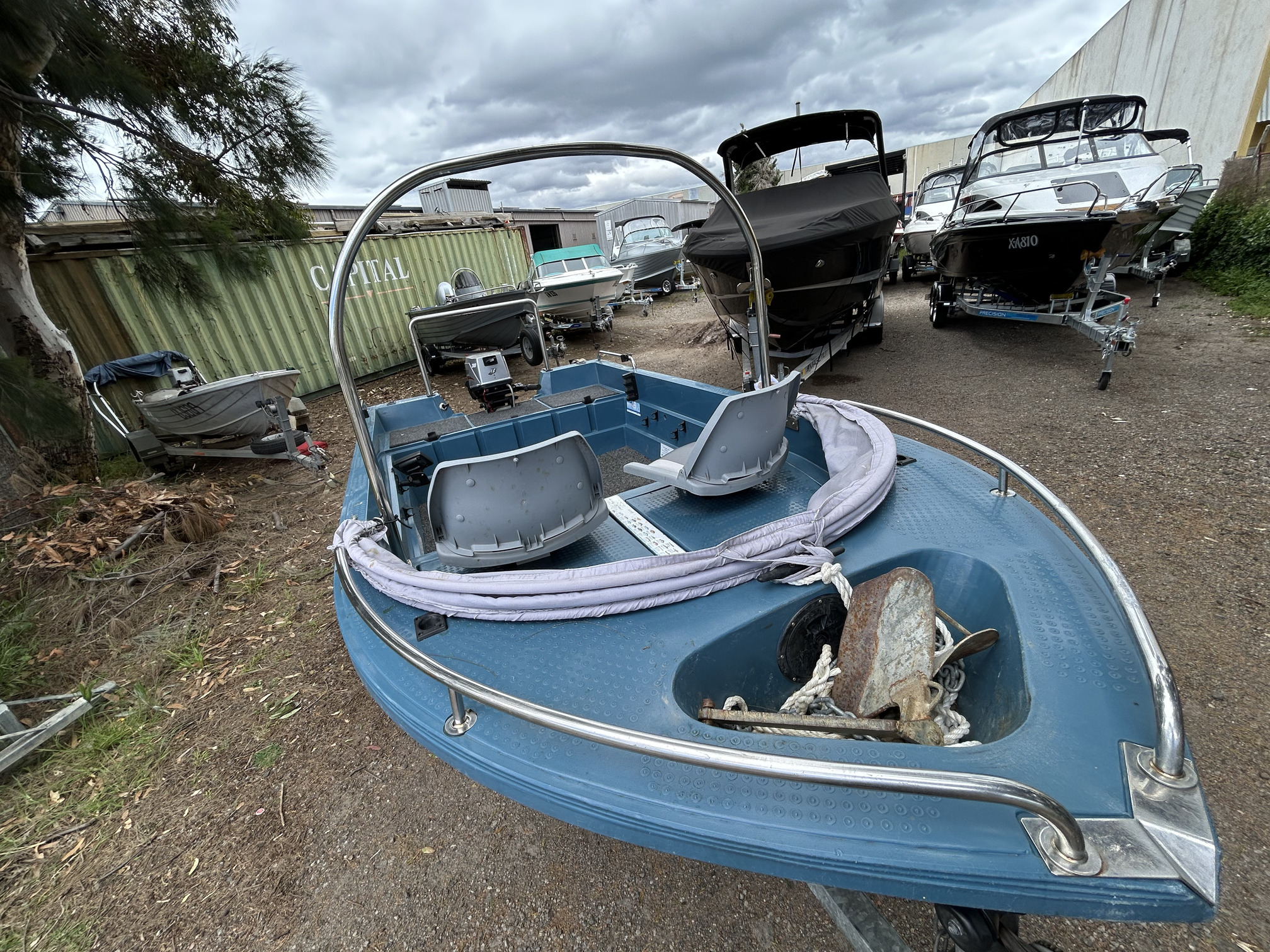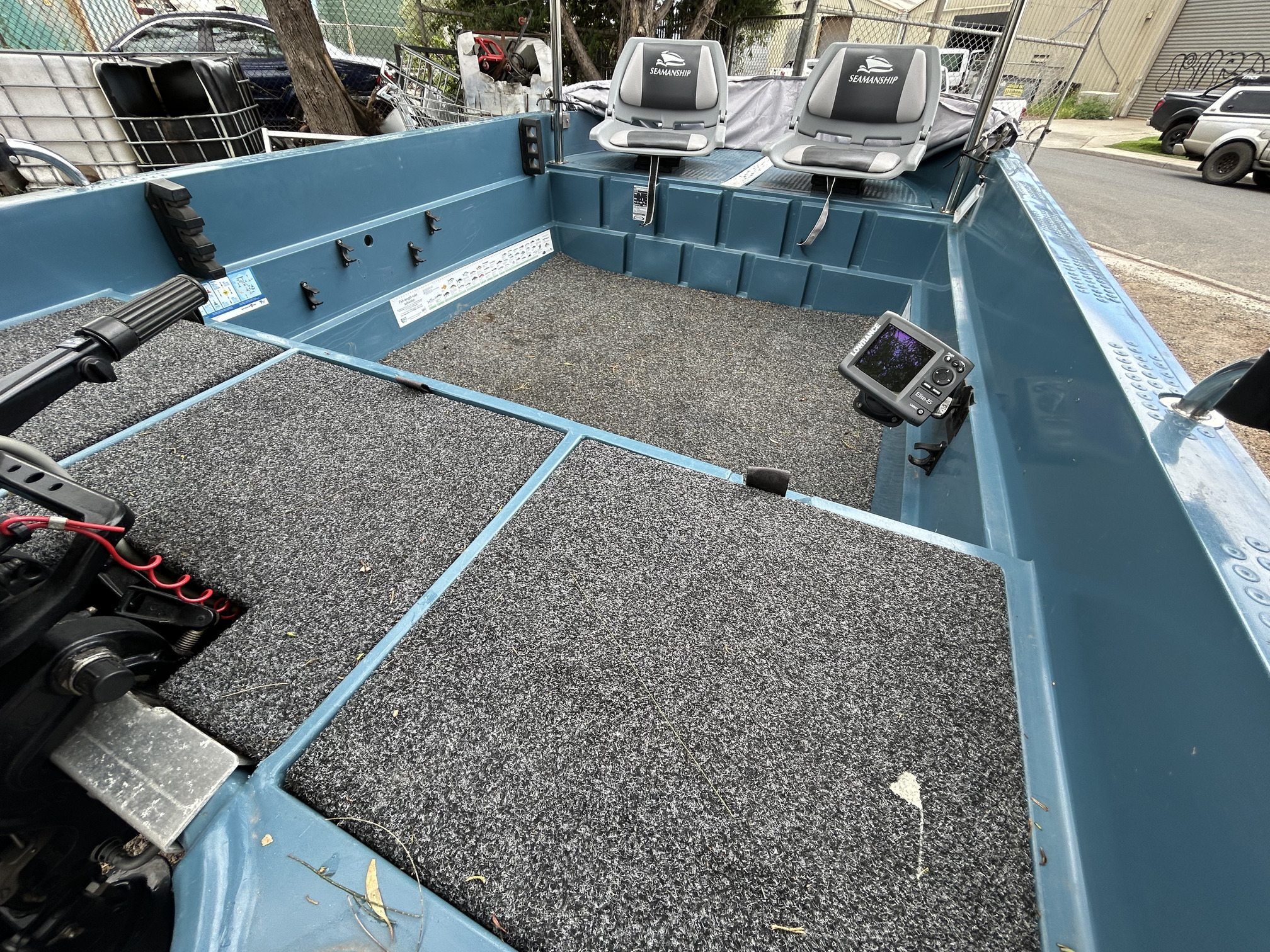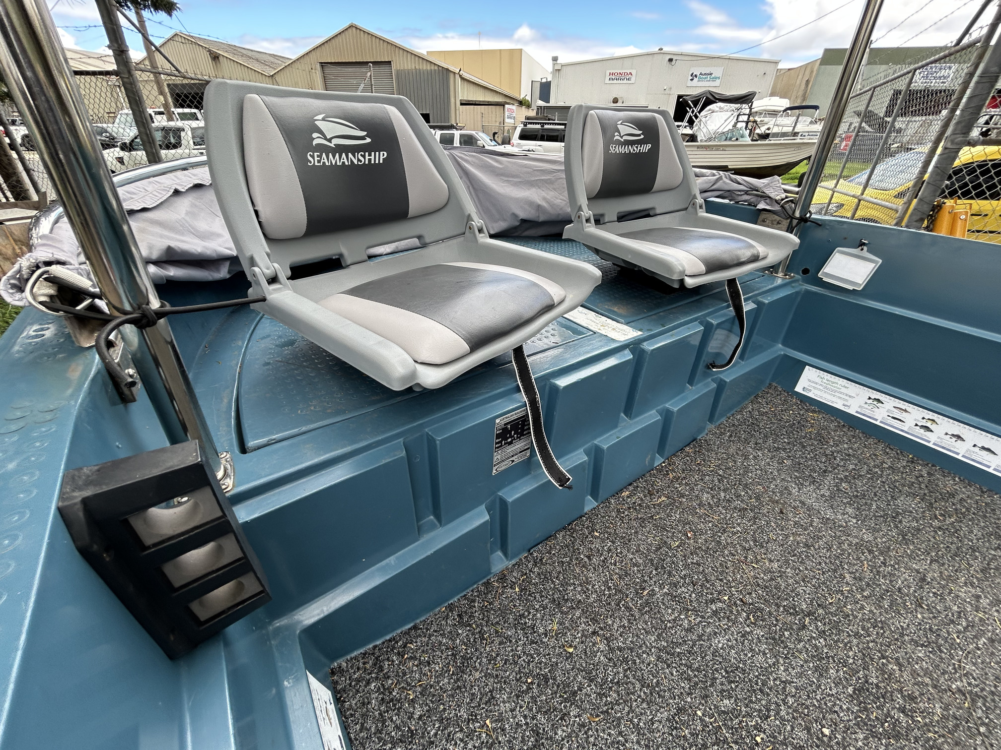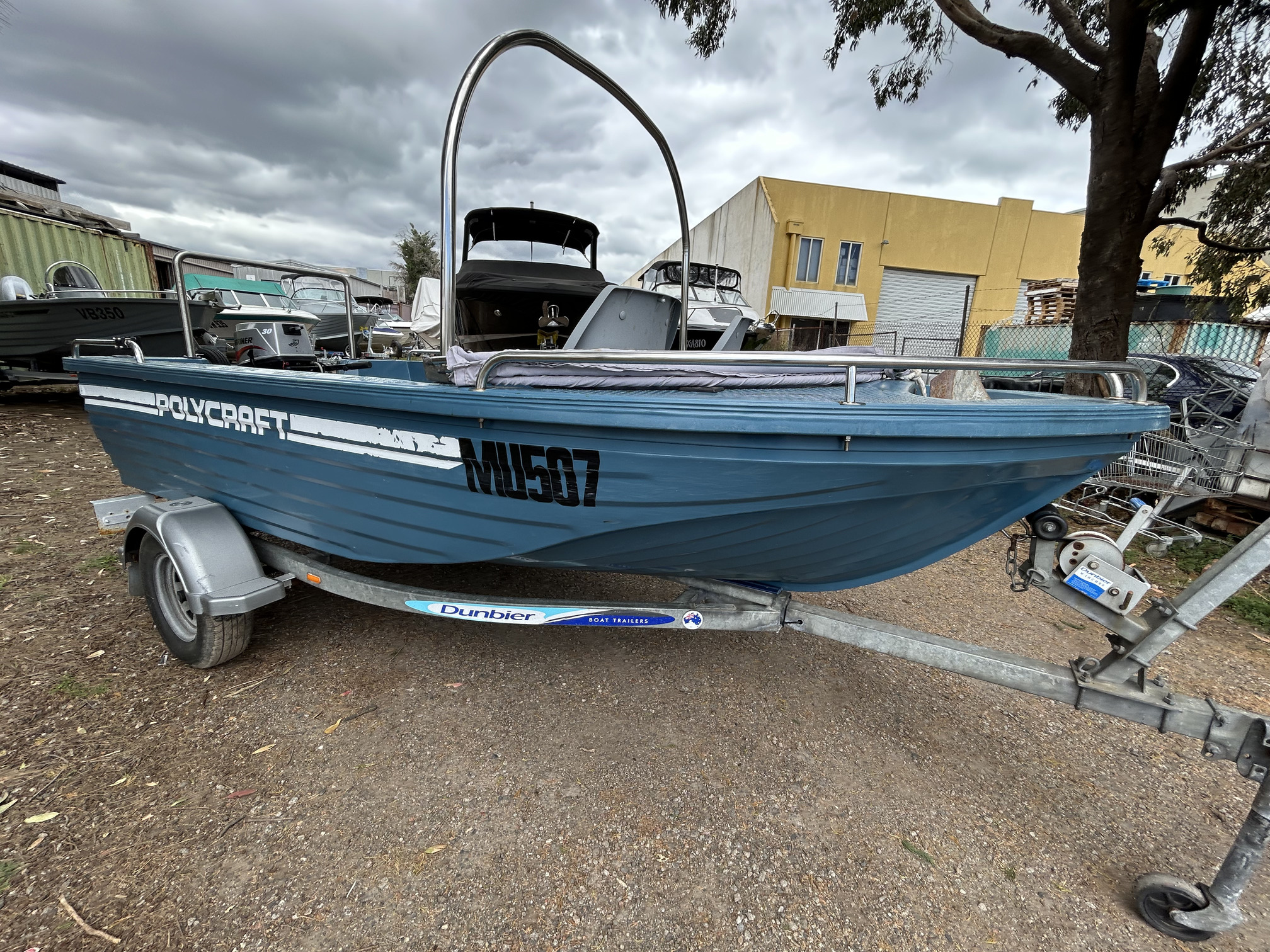 Polycraft 410 Challenger, 2010 model, open deck version, Mariner 30 HP outboard, Dunbier trailer, Lowrance Elite 5 GPS/sounder, marine floor carpet on main floor and rear seats, centre transom infil board, rear storage bait box, swim ladder, stainless frames for dodger and all over cover, rod holders, 2 x swivel seats mounted in bow – perfect to tuck under the dodger and get out of the sun or rain for a comfortable fish and more! These 410 Challengers are super stable and super easy to launch, garage, tow and handle. They are the perfect tributary boat that can tackle rougher bay conditions and they make a great first boat option, especially at this price.