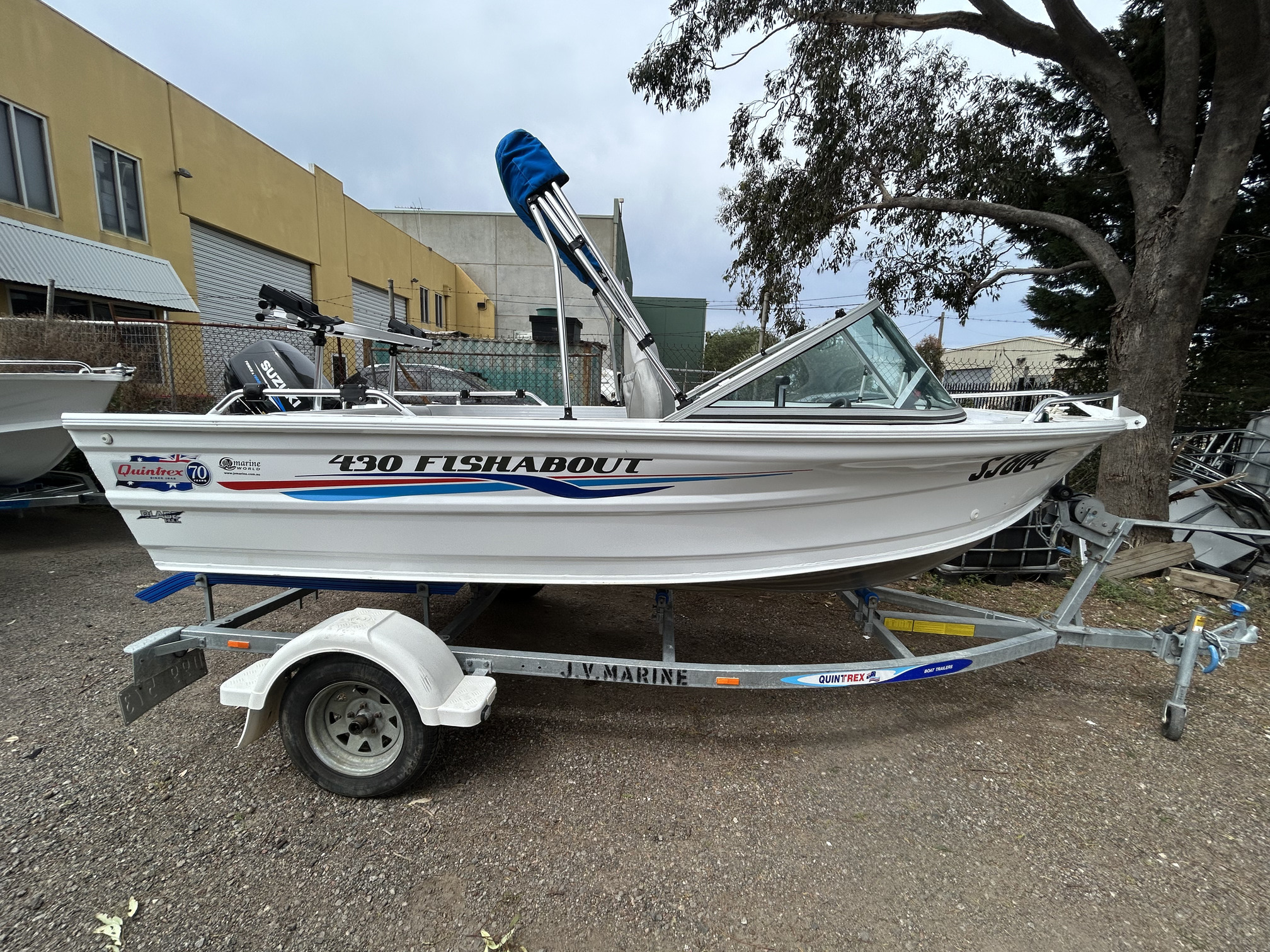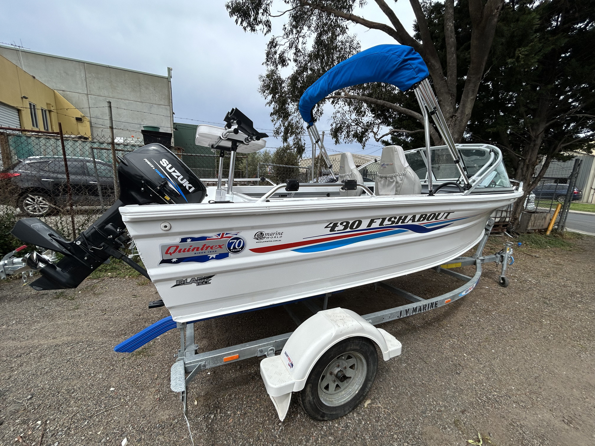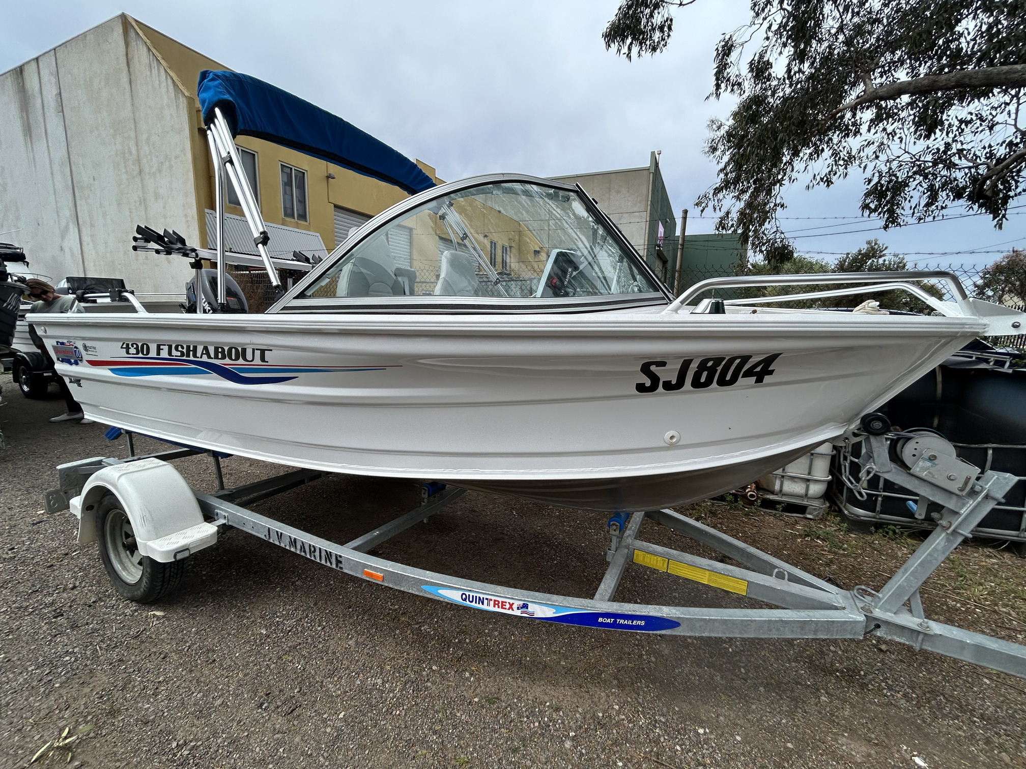 Quintrex 430 Fishabout 2016 model, Suzuki 30 HP, gal trailer, nicely set up with a Lowrance sounder/plotter, bimini, removeable transom seat, removeable bait board, windscreen grab rail, deluxe helm seats, 4 x extra rod holders and battery switch. This boat has been garaged all of its life and is in pristine condition, has very low hours and all the right gear to get you going this season. This year model is the updated ‘blade hull’ design.