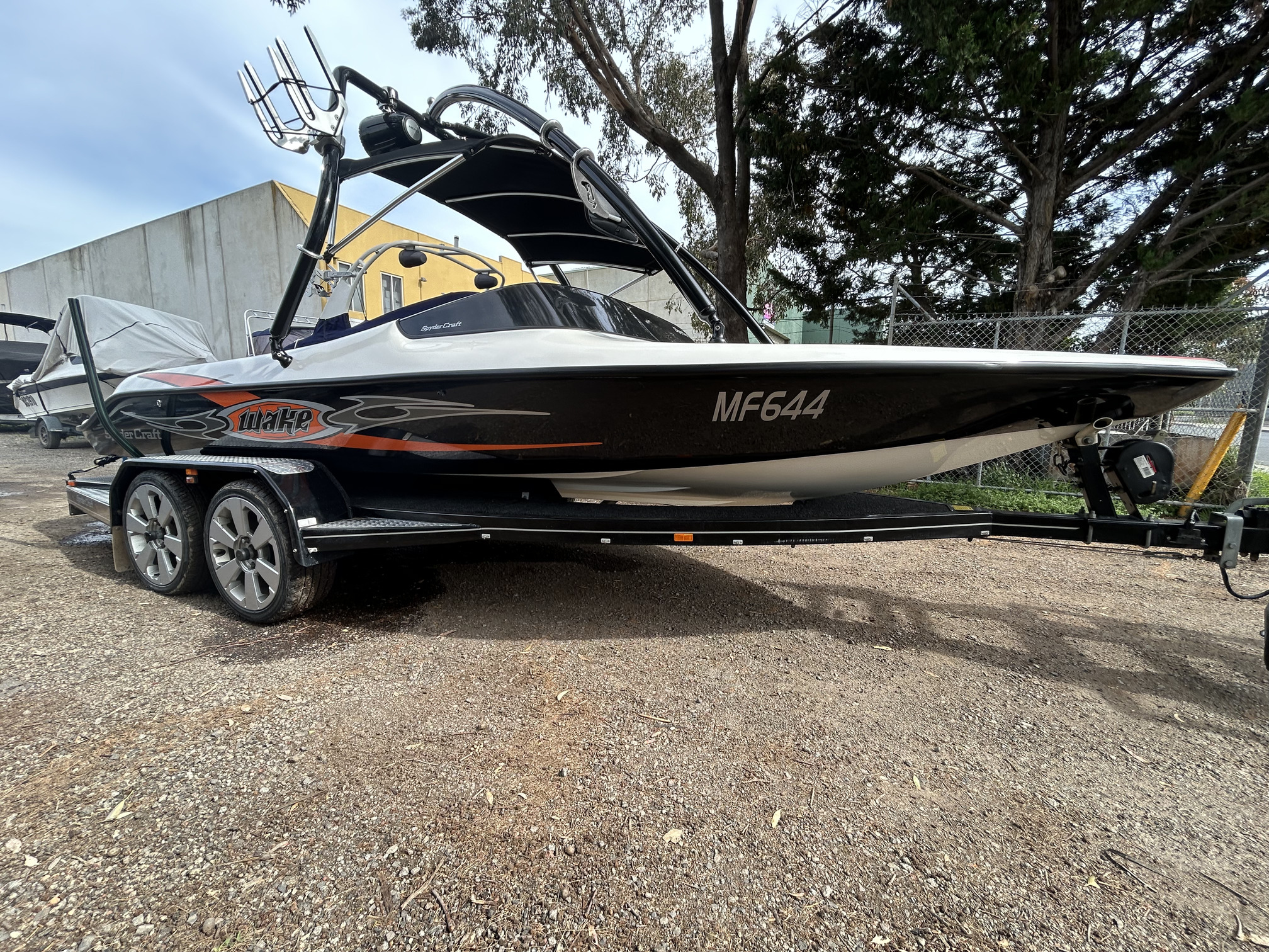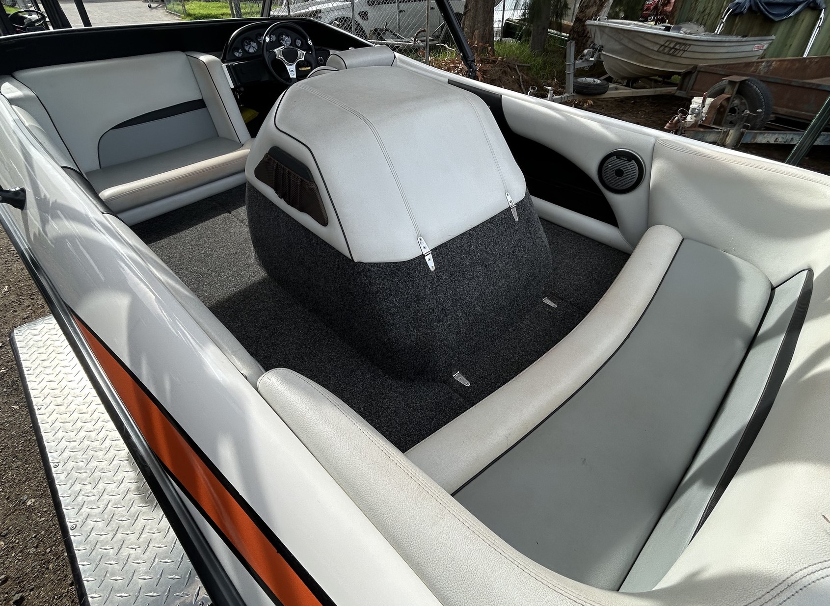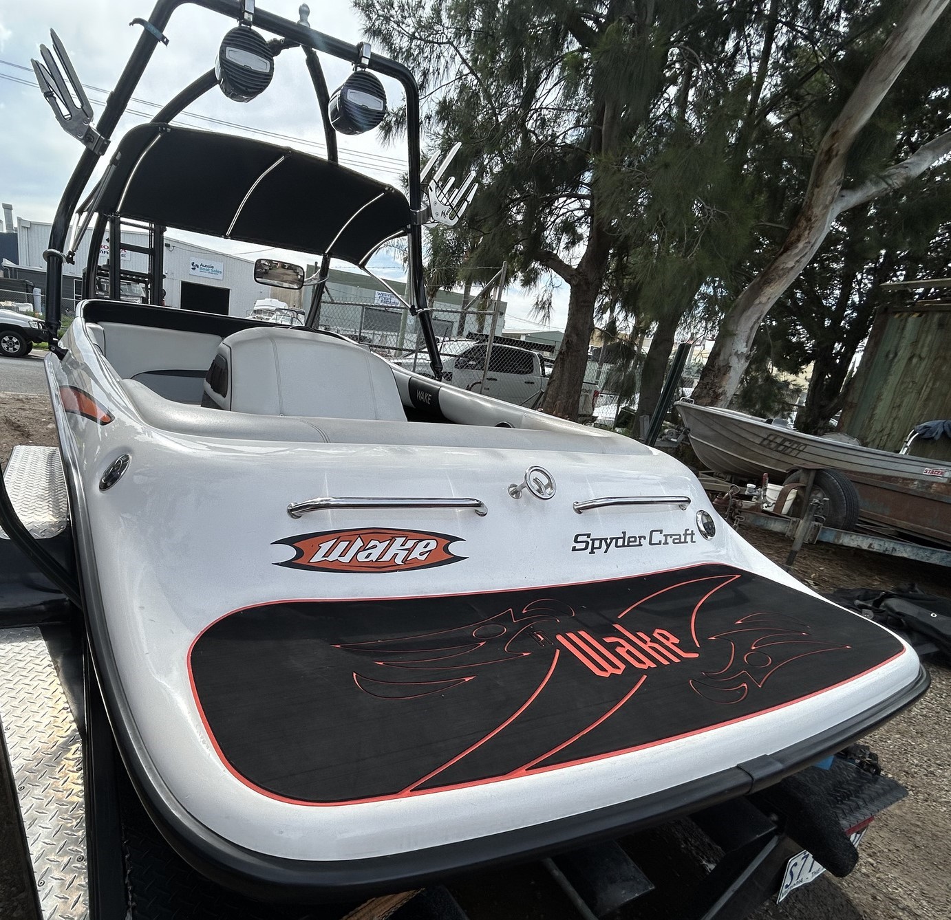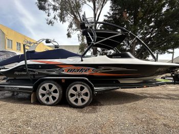 Spydercraft ‘Wake’ model, 6.1m ski boat, (same as a new XFi Illusion) Mercruiser 5.7L V8 LHS, tow sport version, 270 Hp, centre mount (shaft drive) 460 hrs, superb smooth Morse gear shift, Easytow tandem trailer. Nicely set up with Fluidcore wake tower and board racks, bimini, full boat cover with zip on stone guards, recent serious sound system upgrade with a Hertz marine head unit and tower speakers, Kicker amp and subbie, along with an additional Pioneer amp to run the cockpit speakers – solid beats to let everyone know you’re coming! Other goodies include a ski mirror, tilt steering (super convenient in these sports boats), low ski tow point at transom for slalom sessions and a battery isolator. The upholstery is in good nick as is the EVA finish on the swim platform. Really the whole boat is in excellent condition, and we reckon it is the perfect choice for the river, damn or lake this summer, especially at this price. NB: annual service just been done, so ready to go now!