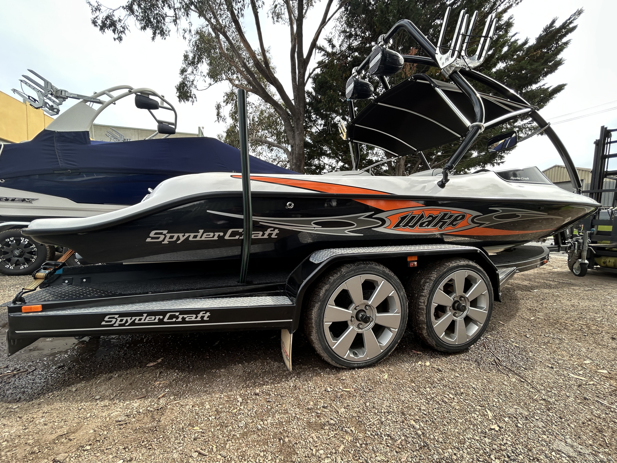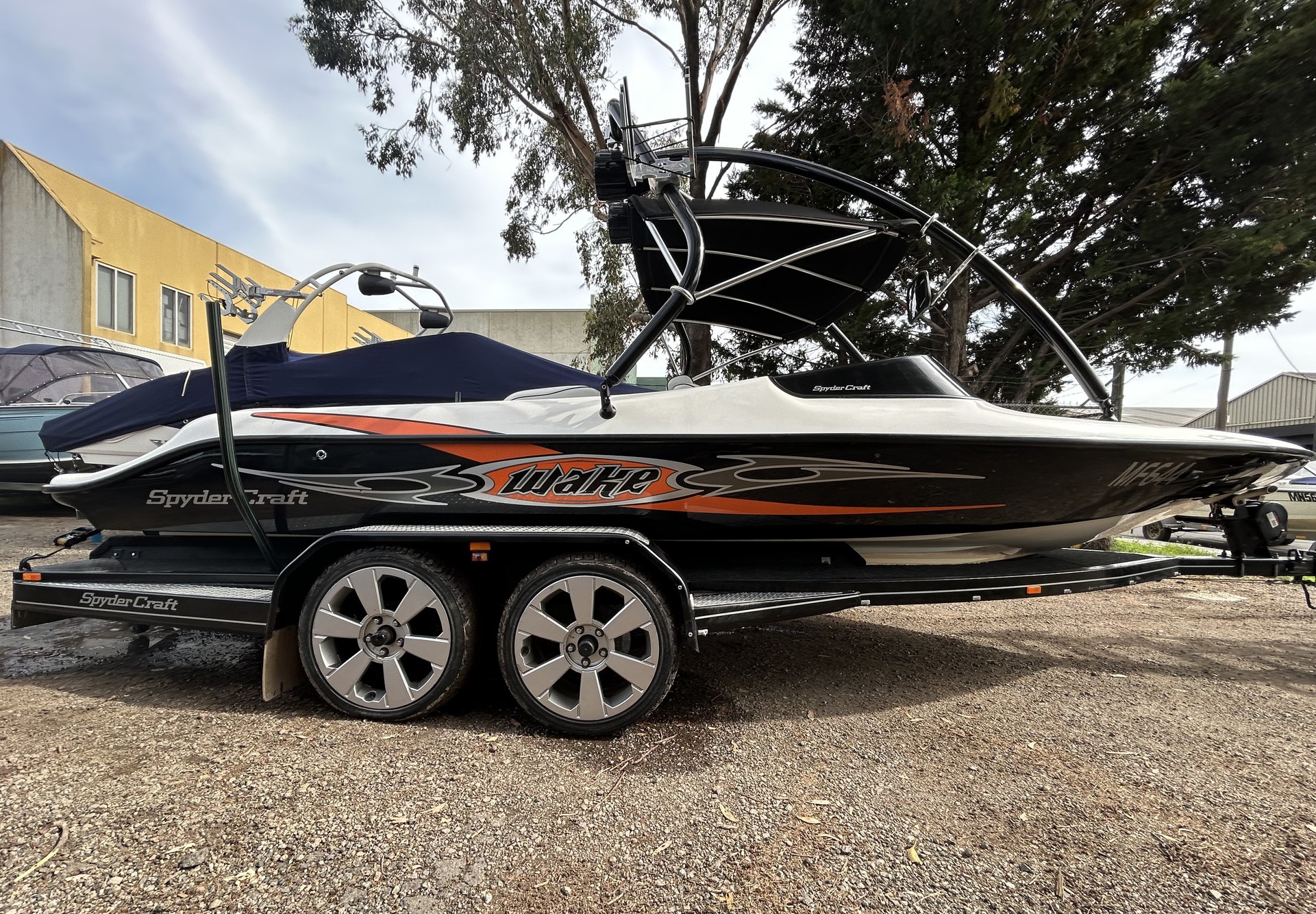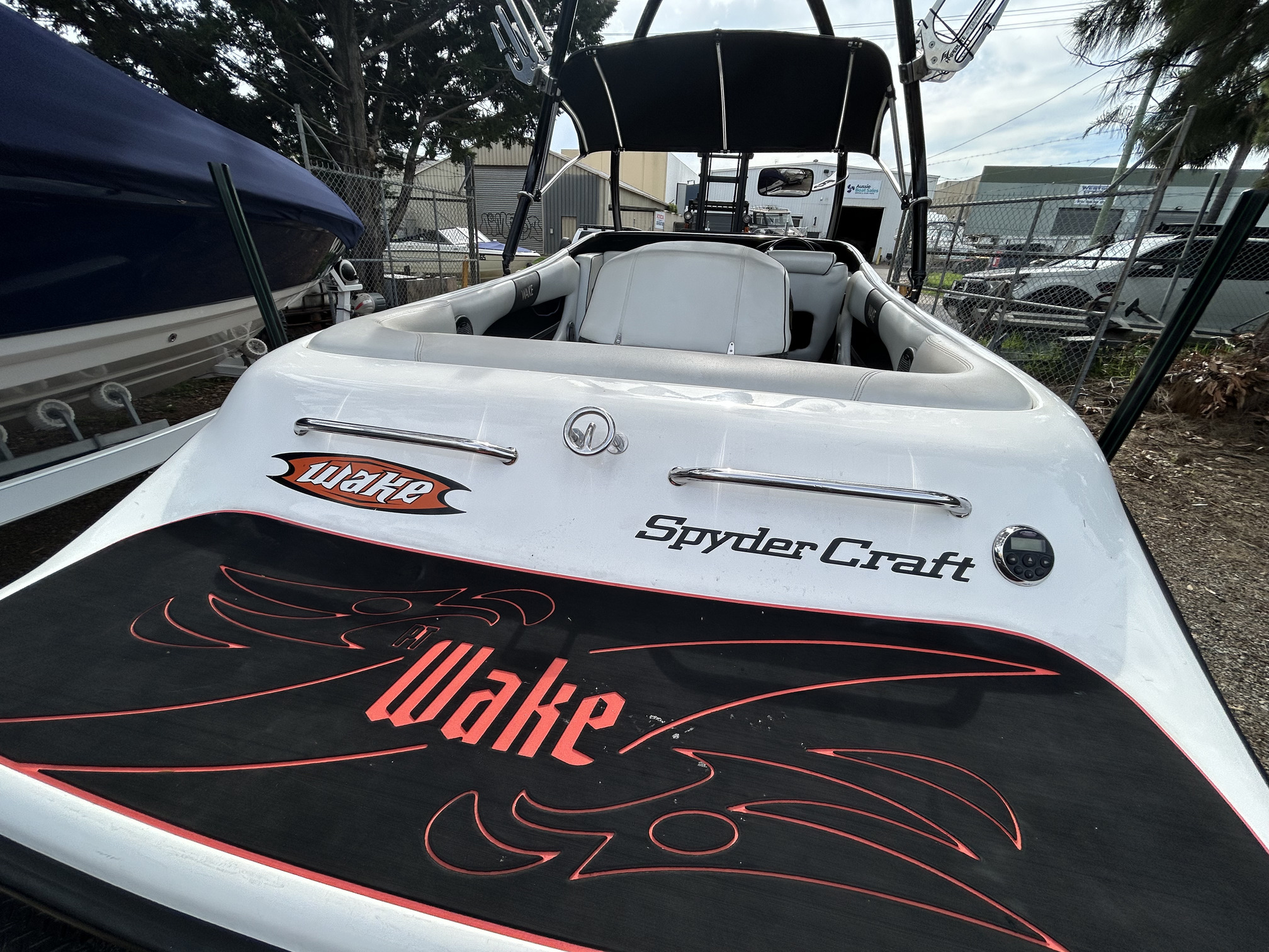 1 Hull/sSpydercraft ‘Wake’ model, 6.1m ski boat, (same as a new XFi Illusion) Mercruiser 5.7L V8 LHS, tow sport version, 270 Hp, centre mount (shaft drive) 460 hrs, superb smooth Morse gear shift, Easytow tandem trailer. Nicely set up with Fluidcore wake tower and board racks, bimini, full boat cover with zip on stone guards, recent serious sound system upgrade with a Hertz marine head unit and tower speakers, Kicker amp and subbie, along with an additional Pioneer amp to run the cockpit speakers – solid beats to let everyone know you’re coming! Other goodies include a ski mirror, tilt steering (super convenient in these sports boats), low ski tow point at transom for slalom sessions and a battery isolator. The upholstery is in good nick as is the EVA finish on the swim platform. Really the whole boat is in excellent condition, and we reckon it is the perfect choice for the river, damn or lake this summer, especially at this price. NB: annual service just been done, so ready to go now!