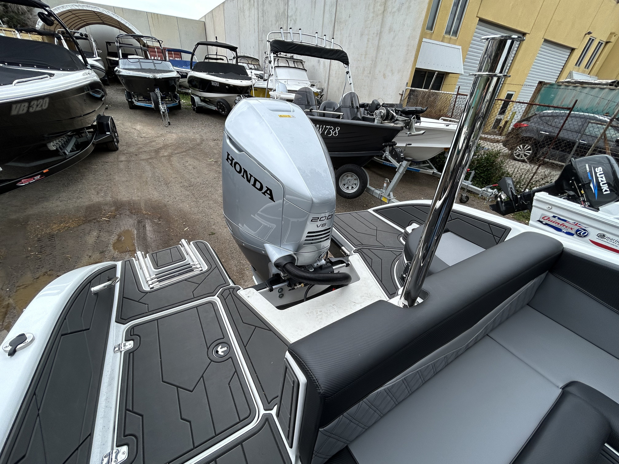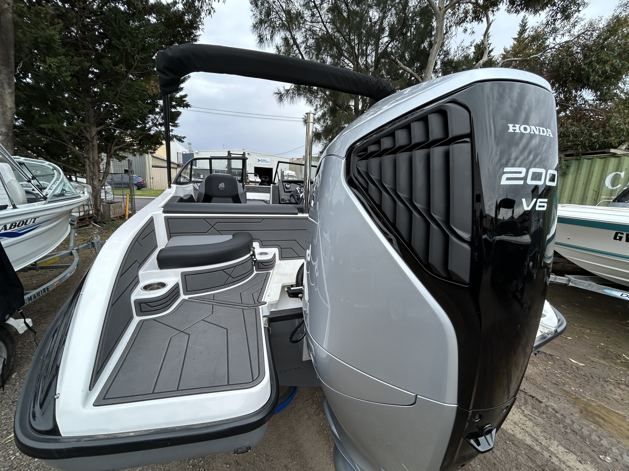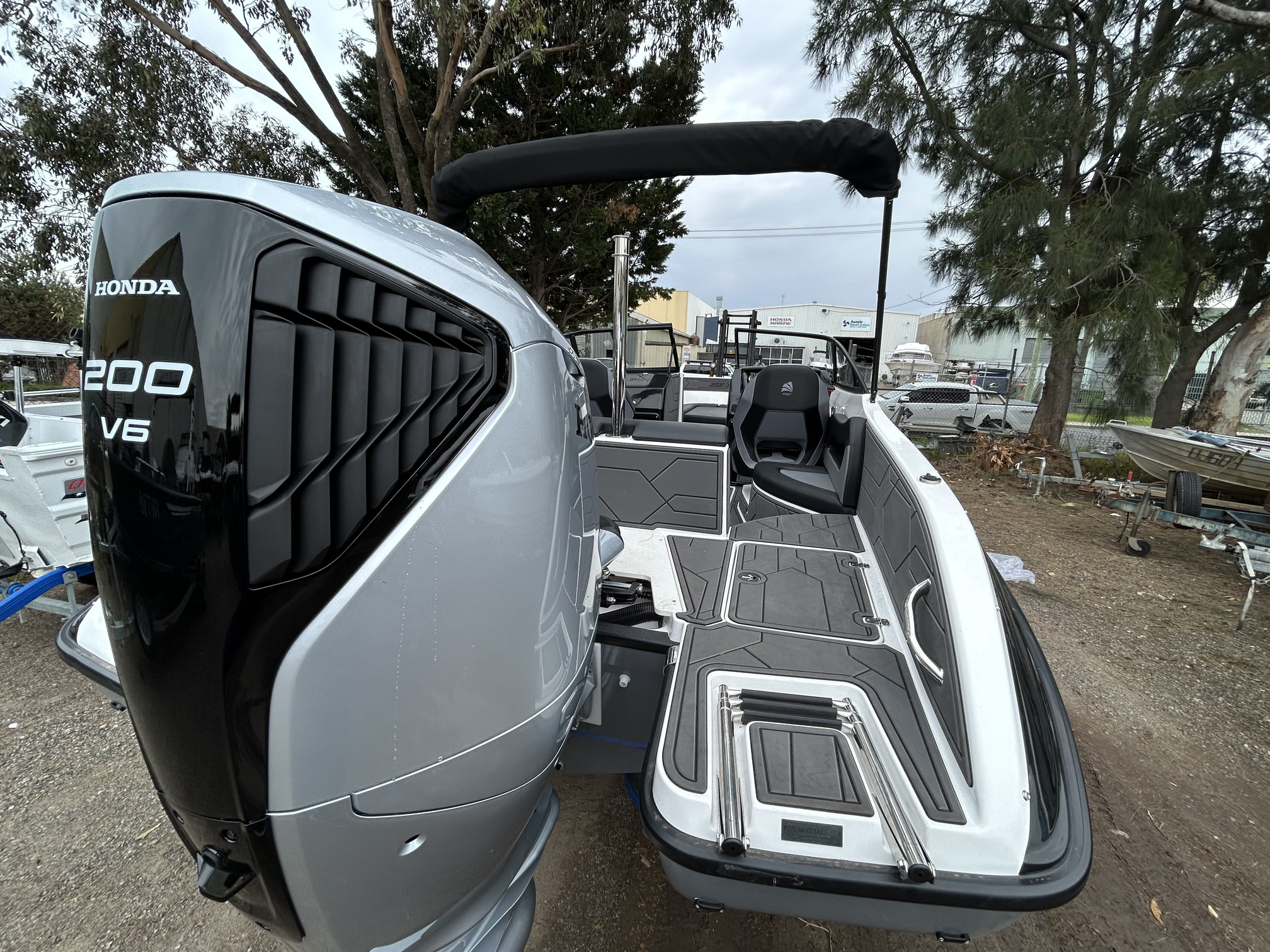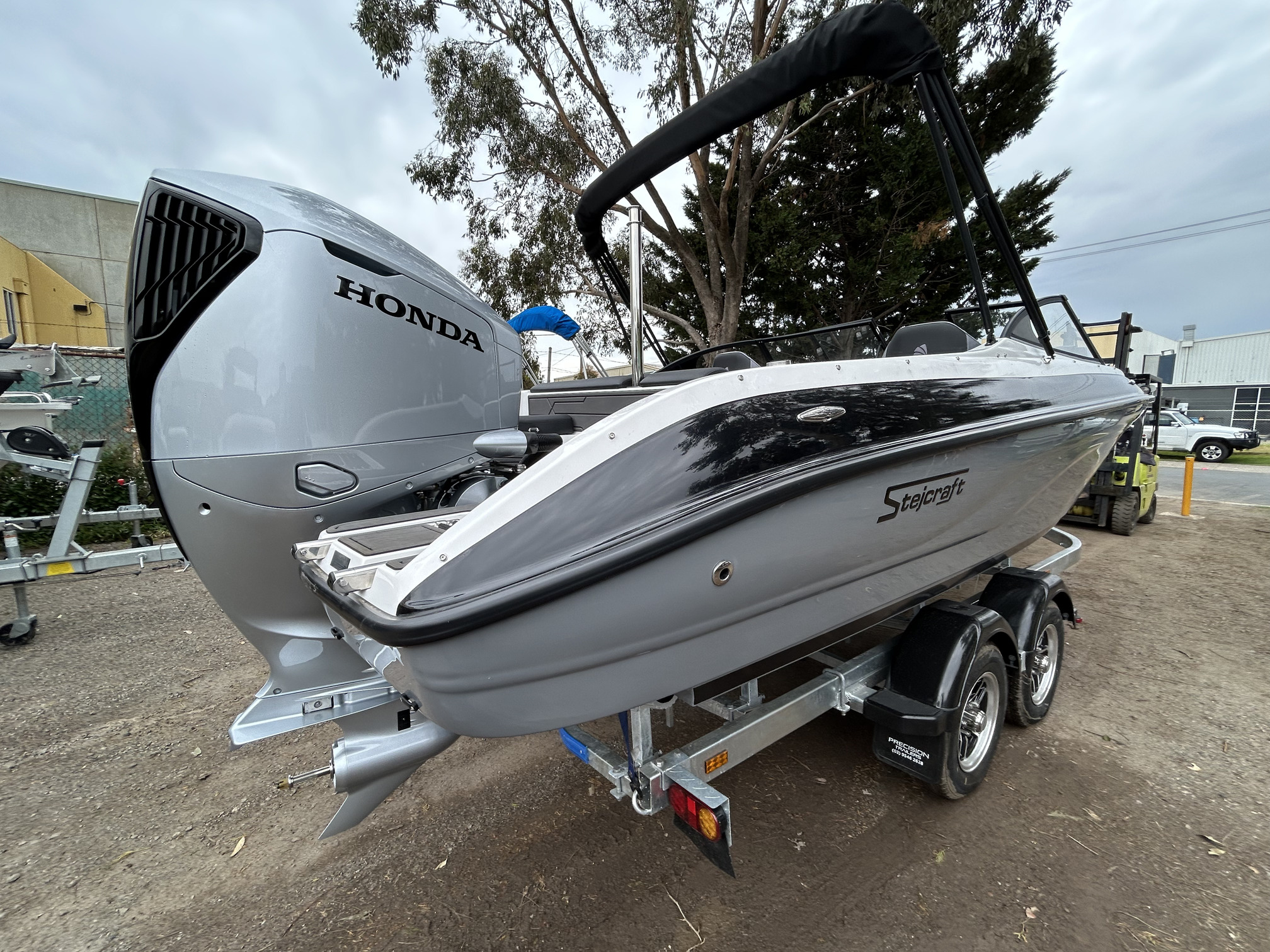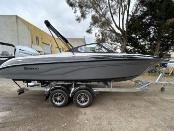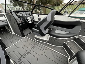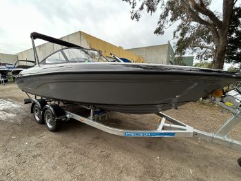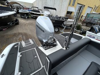 1 Hull/sStejcraft SS64 Bowrider outboard, 2026 model, Honda 200Hp V6, Precision tandem trailer, nicely optioned with ski pole, bimini, bow and cockpit covers, cockpit table, esky, porta toilet, battery isolator, deluxe helm seats, bow infil cushion, colour coded windscreen frame and bimini hoops, modern colour palette with greys and blacks that match the Honda perfectly, price also includes a Garmin GPS/Sounder. (not fitted yet) The SS64 is a proven performer in rougher water with a sharp entry and 21-degree deadrise hull, high free board and tall windscreen. The layout of the outboard version lends itself to social fishing, with a transom seat and good walkaround space fwd of the motor, there is good storage everywhere and with the 200 Hp V6 Honda the performance is mind-blowing. Water ski, fish, cruise – this boat has it all!